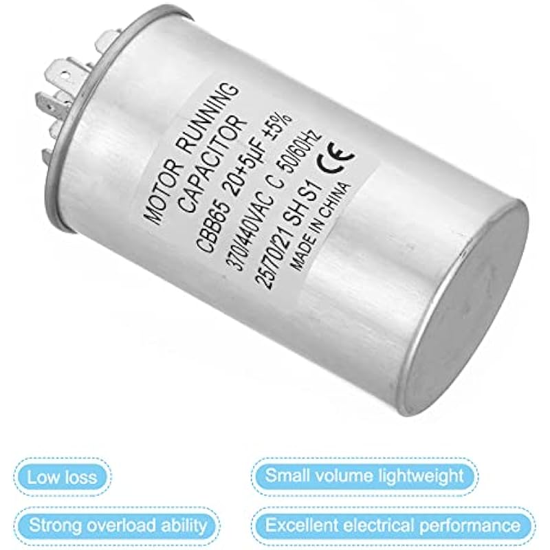 - Specification:Model: CBB65;Material: Metallized Polypropylene, Aluminum Case;Lead End: 3 Terminal(4+4+4pins);Rated Capacity: 20+5uf;Tolerance: ±5%;Rated Voltage: 370/440VAC;Rated Frequency: 50/60Hz;Climatic Category: 25/70/21;Overall Size: 50 x 85mm/1.95 x 3.32inch (D x H); Package Includes: 2Pcs x CBB65 Capacitor
