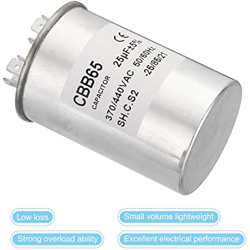 - Specification:Model: CBB65;Material: Metallized Polypropylene, Aluminum Case;Lead End: 2 Terminal (8 pins);Rated Capacity: 25uF;Tolerance: ±5%;Rated Voltage: 370/440V AC;Rated Frequency: 50/60Hz;Climatic Category: -25/85/21;Overall Size: 50 x 75mm/1.95 x 2.93inch (D x H); Package Includes: 1 x CBB65 Capacitor