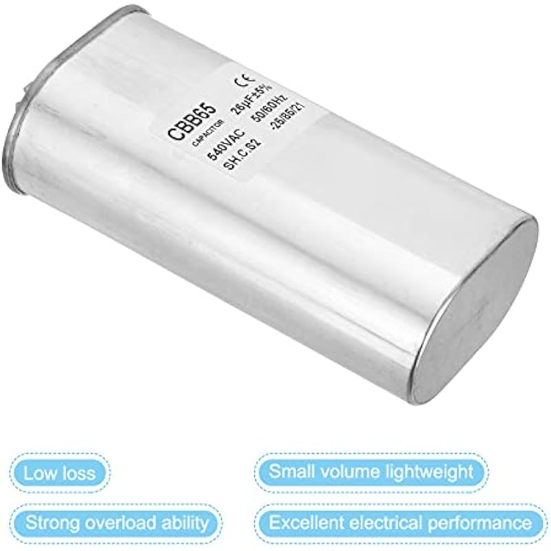 - Specification:Model: CBB65;Material: Metallized Polypropylene, Aluminum Case;Lead End: 2 Terminal (8 pins);Rated Capacity: 26uF;Tolerance: ±5%;Rated Voltage: 540V AC;Rated Frequency: 50/60Hz;Climatic Category: -25/85/21;Overall Size: 71 x 140mm/2.77 x 5.46inch (D x H); Package Includes: 1 x CBB65 Capacitor