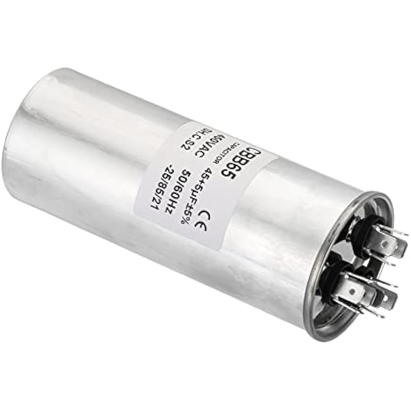 - Specification:Model: CBB65;Material: Metallized Polypropylene, Aluminum Case;Lead End: 3 Terminal (12 pins);Rated Capacity: 45+5uF;Tolerance: ±5%;Rated Voltage: 450V AC;Rated Frequency: 50/60Hz;Climatic Category: -25/85/21;Overall Size: 50 x 125mm/1.95 x 4.88inch (D x H); Package Includes: 1 x CBB65 Capacitor