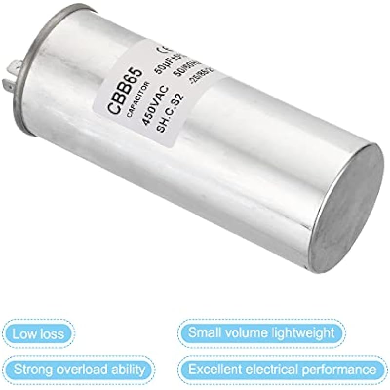 - Specification:Model: CBB65;Material: Metallized Polypropylene, Aluminum Case;Lead End: 2 Terminal (8 pins);Rated Capacity: 50uF;Tolerance: ±5%;Rated Voltage: 450V AC;Rated Frequency: 50/60Hz;Climatic Category: -25/85/21;Overall Size: 50 x 125mm/1.95 x 4.88inch (D x H); Package Includes: 1 x CBB65 Capacitor