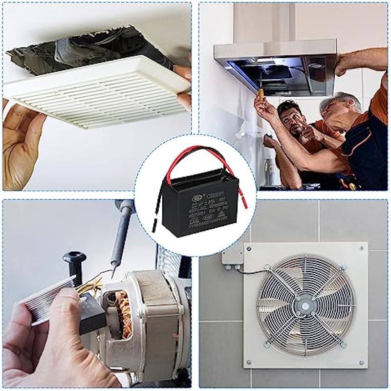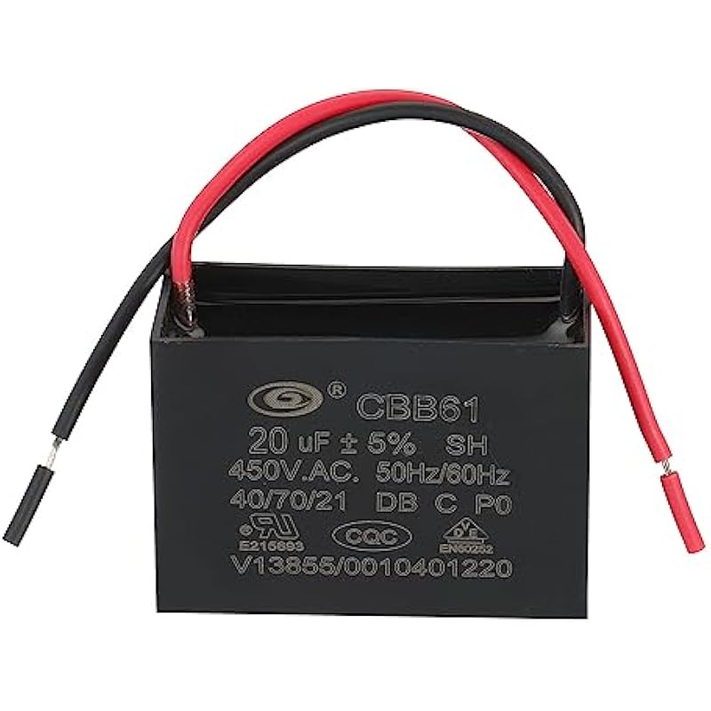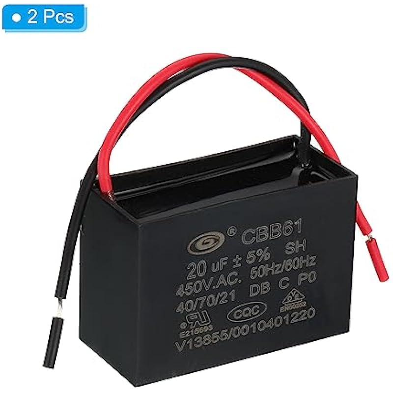 - Model: CBB61; Material: Polypropylene Film Plastic Shell; Terminal: 2 Wires; Tolerance: ±5%; Rated Capacity: 20uF; Climatic Category: 40/70/21; Body Size:60 x 40 x 42mm/2.34 x 1.56 x 1.64 inch(L x W x H); Wire Length:13cm/5.07inch; Shell Color: Black; Rated Voltage: 450V AC; Rated Frequency:50/60Hz; Pack of 2Pcs CBB61 Capacitor