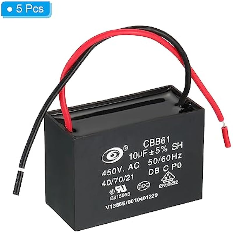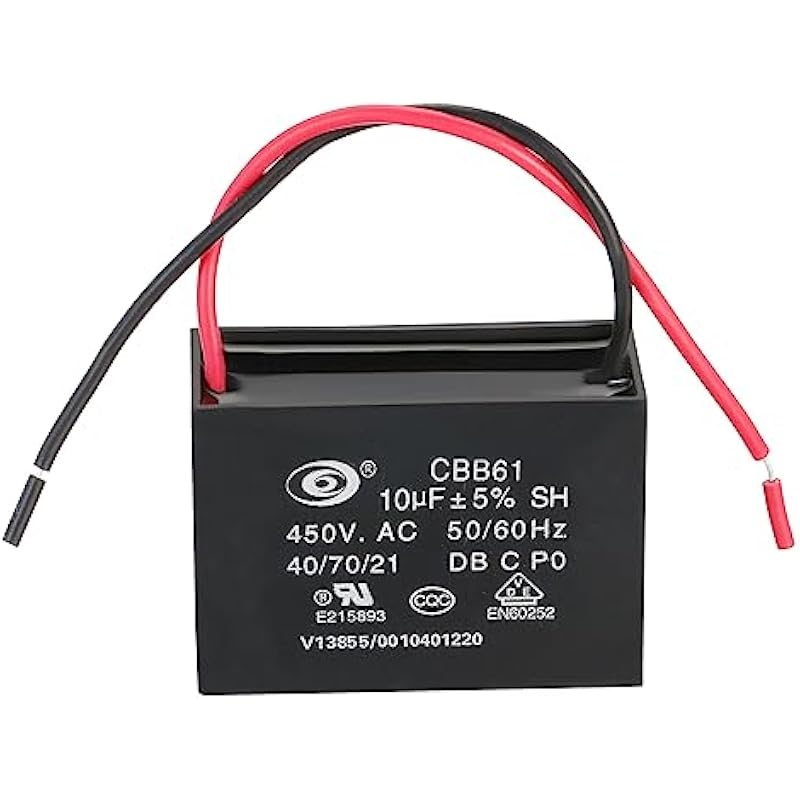 - Model: CBB61; Material: Polypropylene Film Plastic Shell; Terminal: 2 Wires; Tolerance: ±5%; Rated Capacity: 10uF; Climatic Category: 40/70/21; Body Size:60 x 40 x 42mm/2.34 x 1.56 x 1.64 inch(L x W x H); Wire Length:13cm/5.07inch; Shell Color: Black; Rated Voltage: 450V AC; Rated Frequency:50/60Hz; Pack of 5Pcs CBB61 Capacitor