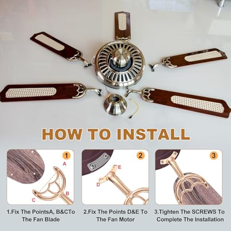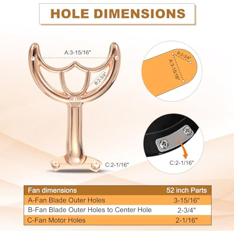 - Caution: Our ceiling fan blade arms are suitable for most 52″ fan blades. Before purchasing, please make sure to measure and confirm the size of the fan blade arm holes(as the picture shows) to ensure they match your ceiling fan blades.