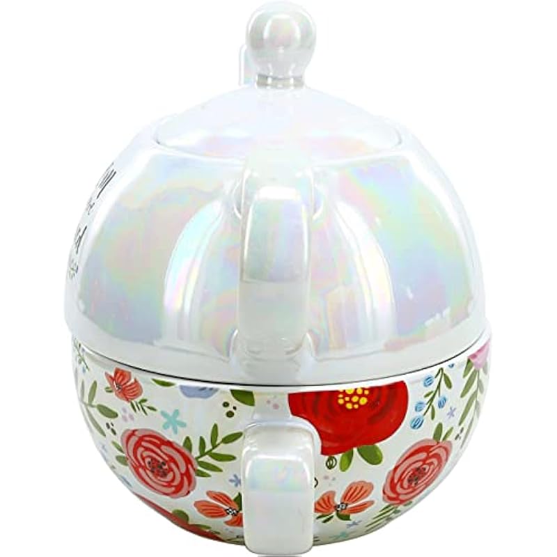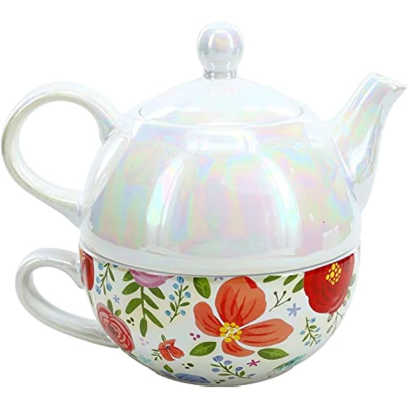 - IN-HOUSE DESIGN: The beautiful floral design goes all the way around the teacup, excluding the handle and interior of the mug; which is white. The teapot has a shiny bubble like iridescent finish and is topped off with a plain white lid.