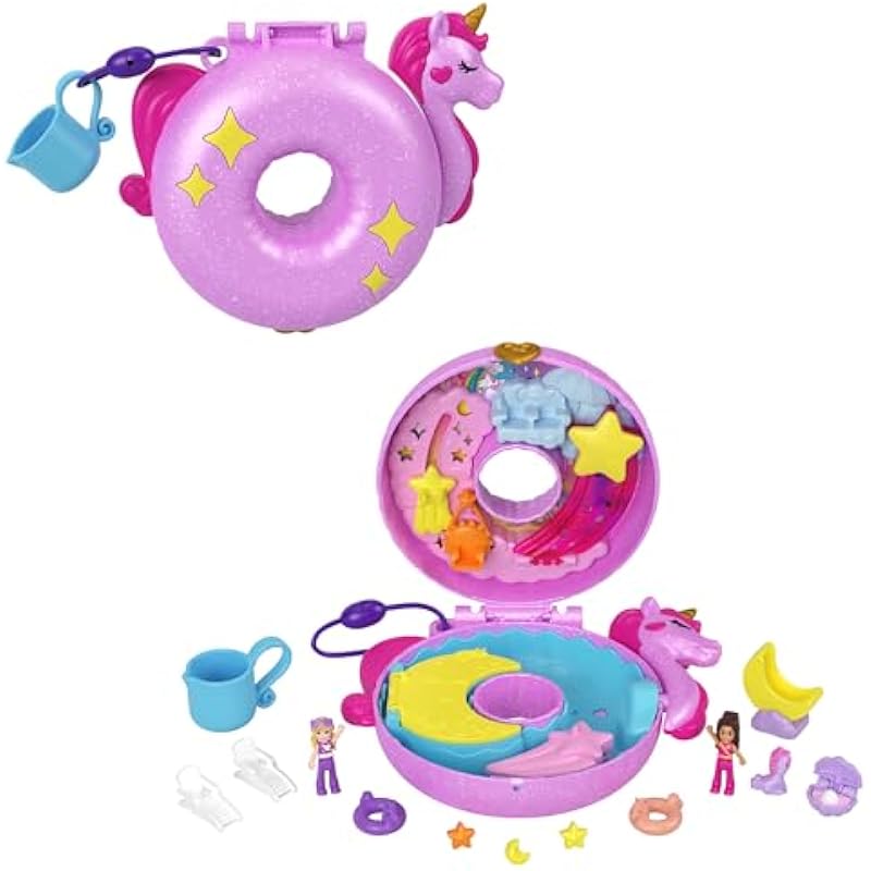 - This Polly Pocket Unicorn Floatie Compact opens up to a magical pool party with micro Polly doll and friend!