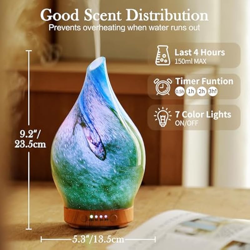 - UNIQUE ART DECORATIVE DESIGN – Our 100ml glass essential oil diffuser has a firework 3D effect glass cover and wood grain decorative base. It is very suitable for your bedroom, living room, children’s room, study room, office, and yoga room.