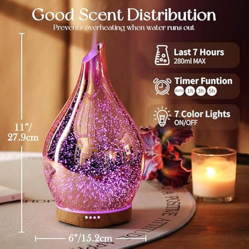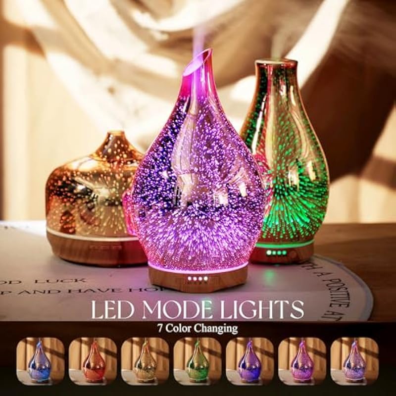 - STUNNING LIGHTING SHOW – When using this glass diffuser at home with your lover and family, watching the beautiful firework effect like a starry sky, you will feel extremely romantic and warm.You also can select the 7colors on your mood,use the mist and light modes individually or together.