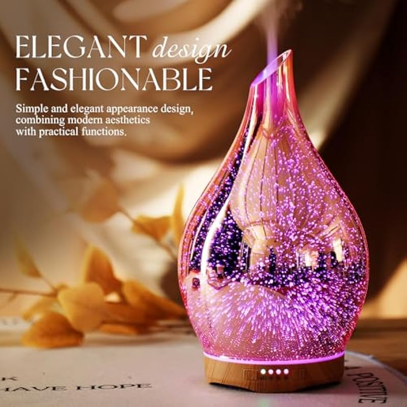 - UNIQUE ART DECORATIVE DESIGN – If you need an ornament in your home,this special handmade glass essential oil diffuser is your perfect choice,this aroma diffuser use glass cover and wood grain decorative base. It is extremely suitable for decorating your bedroom, living room, children’s room, study room, office and yoga room.