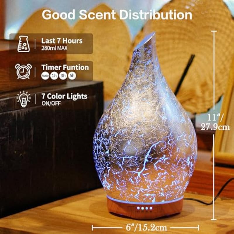 - SMART TIMER FUNCTION – The glass diffuser capacity is 280ml which last for 7hours.Time mode has auto/1/3/5 hours that will meet all your needs when working, reading and relaxing.Your life and work will be full of romantic and soothing fragrance.Fits a room not larger than 15*15(ft).