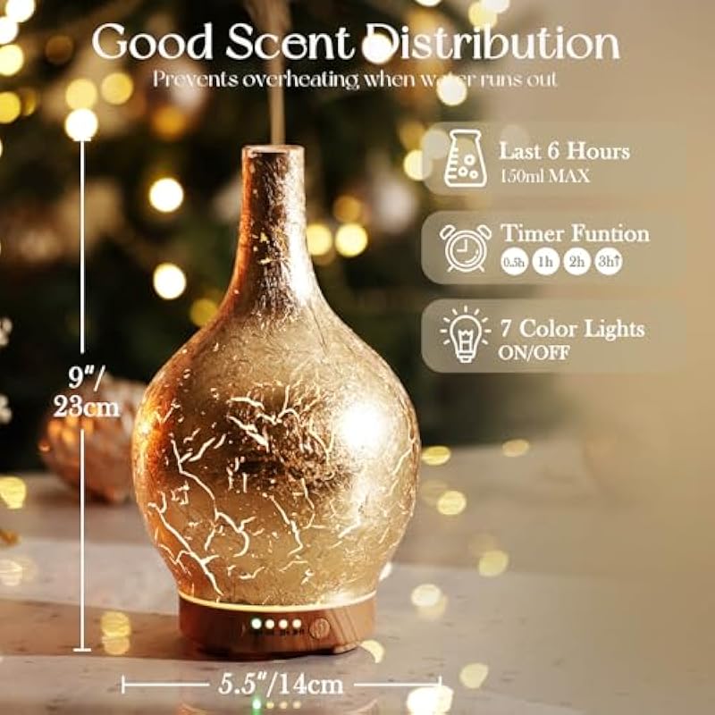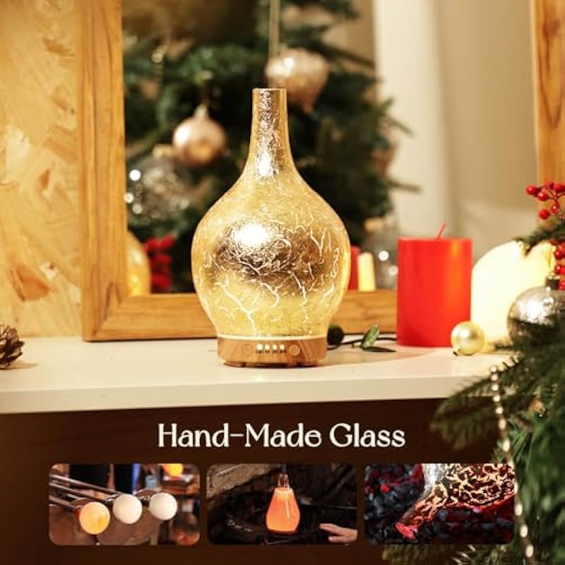- UNIQUE ART DECORATIVE DESIGN – Our 150ml glass essential oil diffuser has a gold plated effect glass cover and wood grain decorative base. It is very suitable for your bedroom, living room, children’s room, study room, office, and yoga room.