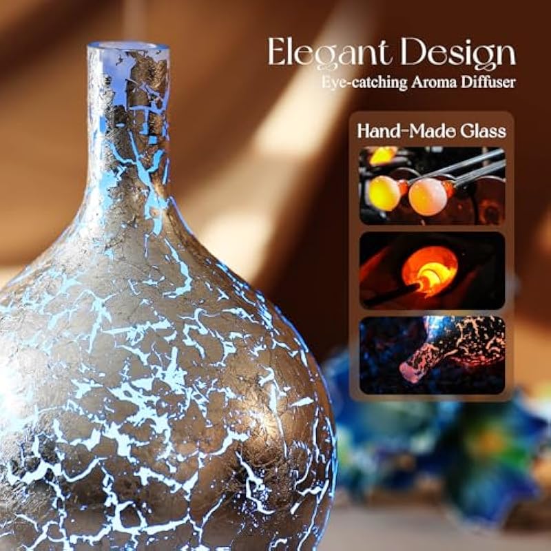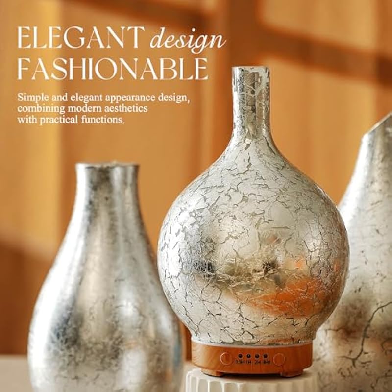 - UNIQUE ART DECORATIVE DESIGN – Our 150ml glass essential oil diffuser has a silver plated effect glass cover and wood grain decorative base. It is very suitable for your bedroom, living room, children’s room, study room, office, and yoga room.