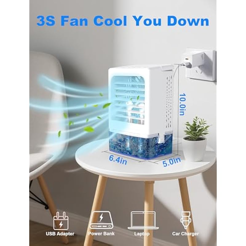 - Space-Saving & Portable Design: Our mini air cooler size of 6.38*4.92*10 inches and weighs only 2.2 pounds, making it an ideal choice for saving space. Perfect for placement on your bedside, desk, or even for outdoor activities like picnics and camping trips! The built-in handle ensures easy portability, allowing you to move it effortlessly wherever you go. No installation. It’s 8W, compared with other large air coolers, it can save a lot of electricity bills