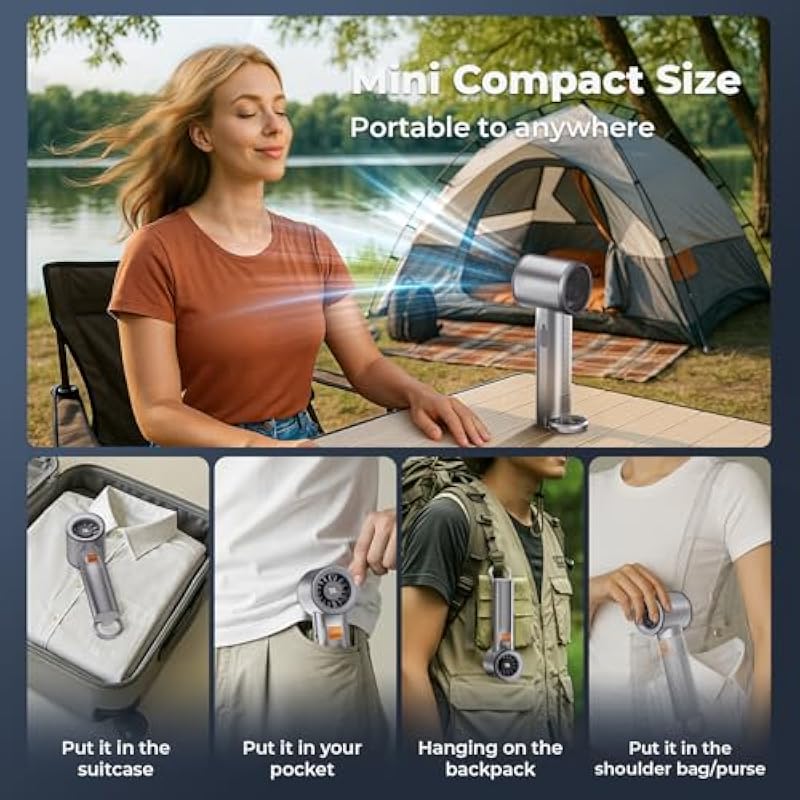 - ❄Powerful Wind & Excellent Cooling – Powerful portable handheld fan adopts turbo structure design,ensuring that wind and airflow is more powerful and strong than ordinary handheld fans.The cool wind is stronger when the portable fan is running highest wind gear. The turbo handheld fan is providing a maximum wind speed of up to 7 m/s. 12000 RPM. Enjoying the maximum cooling wind