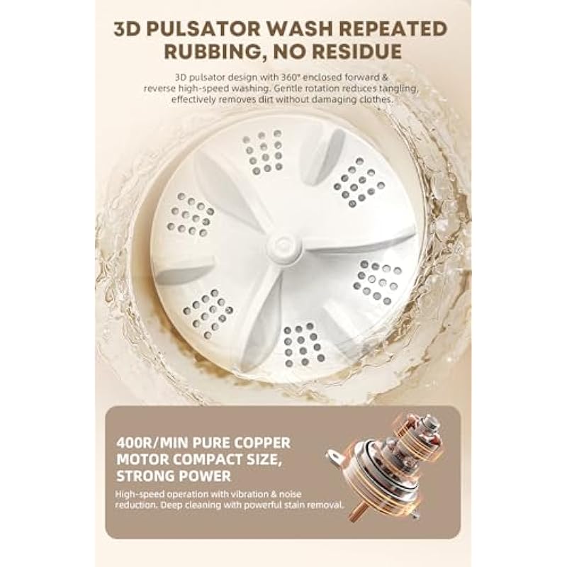 - 【Efficient 360° Wash Technology】The dual-direction 3D agitation wheel combined with a 400 r/min copper motor ensures powerful scrubbing while protecting fabrics. It removes dirt thoroughly, keeping garments fresh and clean with reduced noise and vibration.