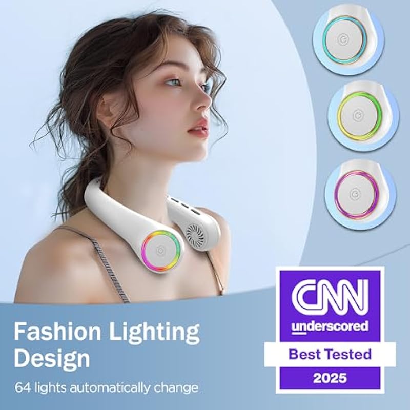 - 【Stylish Lights】The addition of 64 cool auto-changing lights (long press for 3 seconds) adds a touch of irresistible fashion charm to the personal fan. Not only does it increase the fun of using it, but it can also perfectly match every kind of your outfit.
