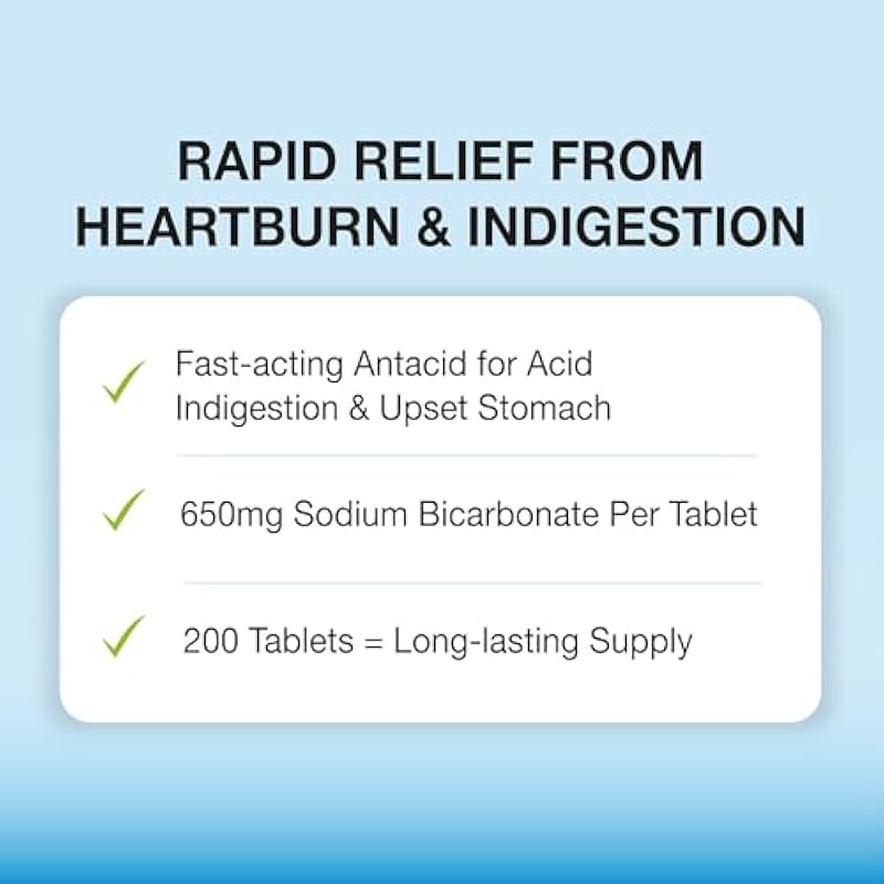 - Value Bottle – 200 Tablets – Long-lasting supply of sodium bicarbonate tablets, designed for those seeking a natural, versatile, and cost-effective antacid and alkalizing supplement.
