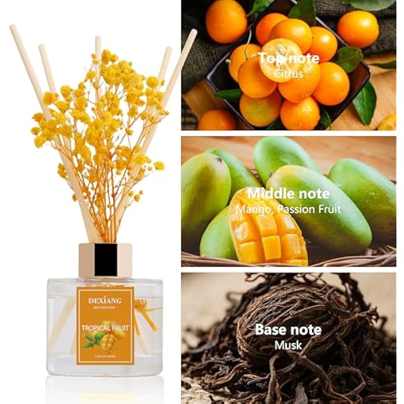 - Vibrant citrus top notes burst with freshness,blending into a tropical mango-Passion fruit heart,before settling into a warm, musky base.