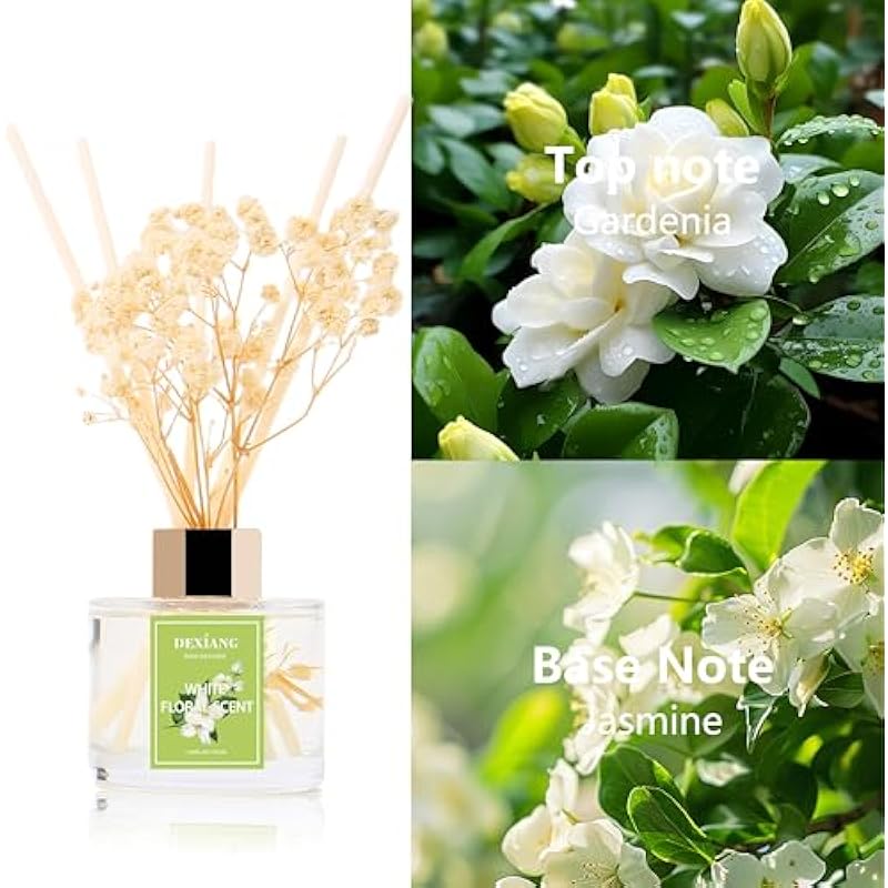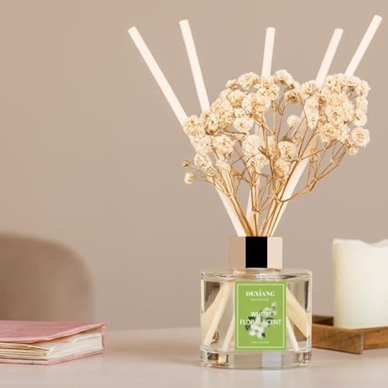 - Included:(l)A bottle of fragrance diffuser(2)3.38 ounces of scentedblend essential oils(3)A pack of real preserved baby’s breath flowers (4)6pure cotton sticks You can choose to add or reduce the number of reed sticksto suit your taste.