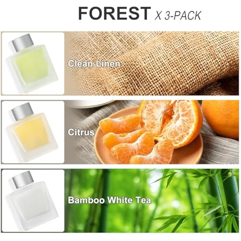 - [ Linen/Citrus/Bamboo White Tea – Forest Aroma ] The 3-pack aromatherapy perfume set include not only the sweetness of fruit, the fresh flavor of linen, but also the fragrance of green bamboo and white tea, providing your home with rich forest flower and fruit fragrance.