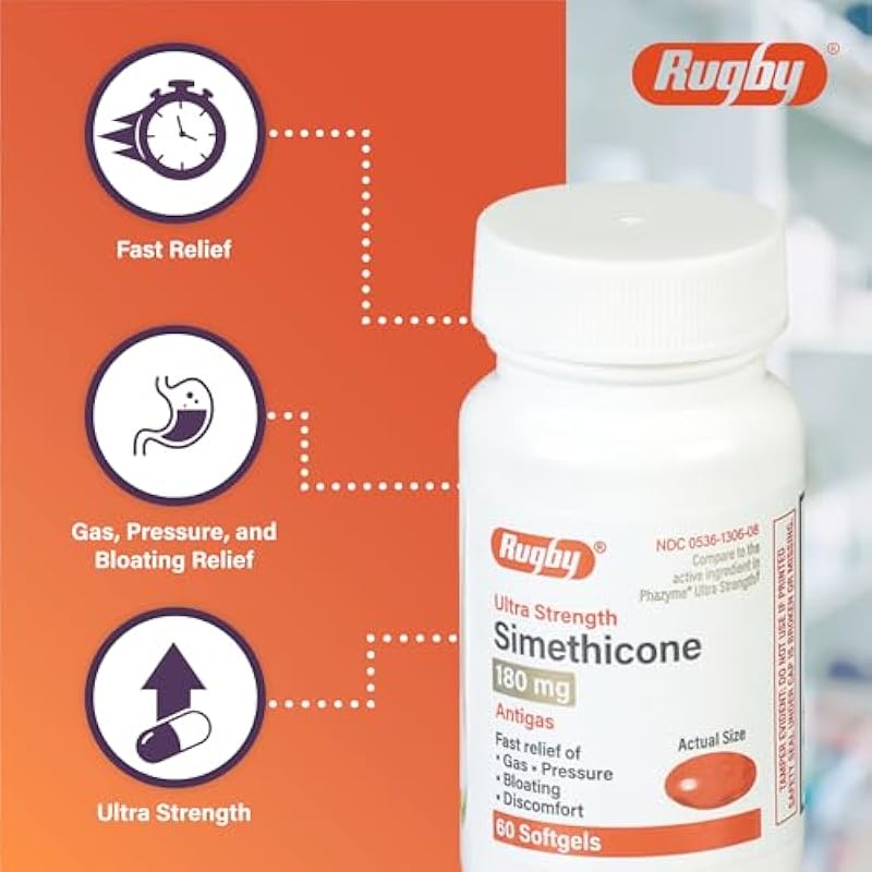 - GAS RELIEF FOR ADULTS: The Rugby Ultra Strength Simethicone Gas Relief pills are a trusted remedy that may help reduce symptoms associated with stomach gas discomfort. These softgel gas pills may help support relief of flatulence, bloating, and fullness.