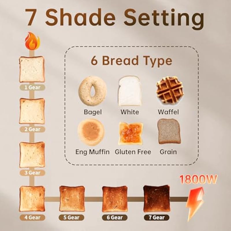 - Various Breads and Flavors: The toaster provides 7 bread shade Setting from light yellow to deep dark. And set different toasting times for 6 kinds of bread, including bagel, white, waffle, eng.muffin, gluten free, grain, meet different taste requirements.