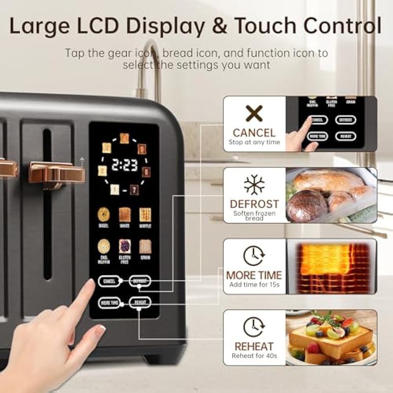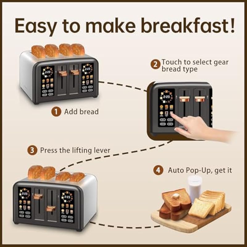 - Large Capacity & Dual Control: Having two independent touch control screens, it can simultaneously bake different types of bread and set different shades for them. Toast 2 or 4 slices as you wish, Providing breakfast for the whole family, saving you more time on a busy morning.