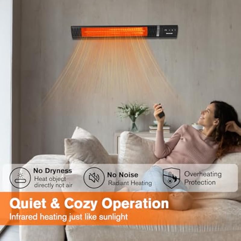 - 1500W Power with gold coated halogen heating element covering up to 80 sq.ft., infrared heating transfer heat only to people on its radiant wave path, provide instant and clean heat without noise and air dryness
