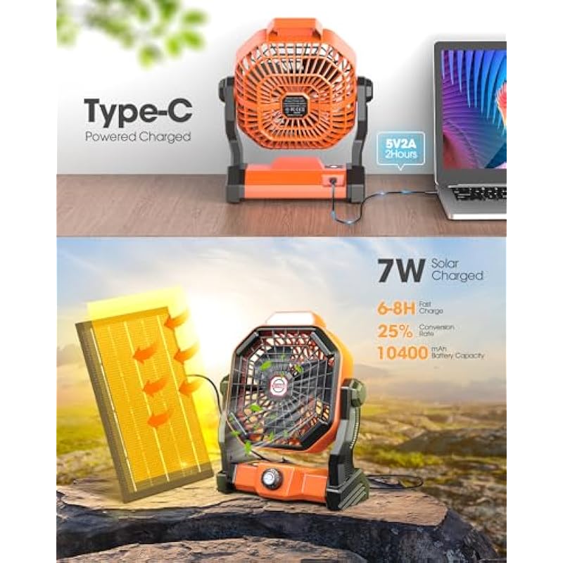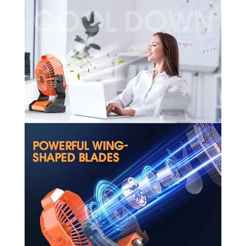 - 🌞【Adjustable & Durable Design】– This rechargeable fan features a 270° adjustable rotation, allowing you to direct the airflow exactly where you need it. The built-in hanging hook makes it easy to suspend in a tent, saving space while keeping you cool. Crafted from sturdy ABS material, it withstands impacts, making it perfect for outdoor adventures. Plus, its stylish punk-inspired design doubles as a sleek desk fan for indoor use.