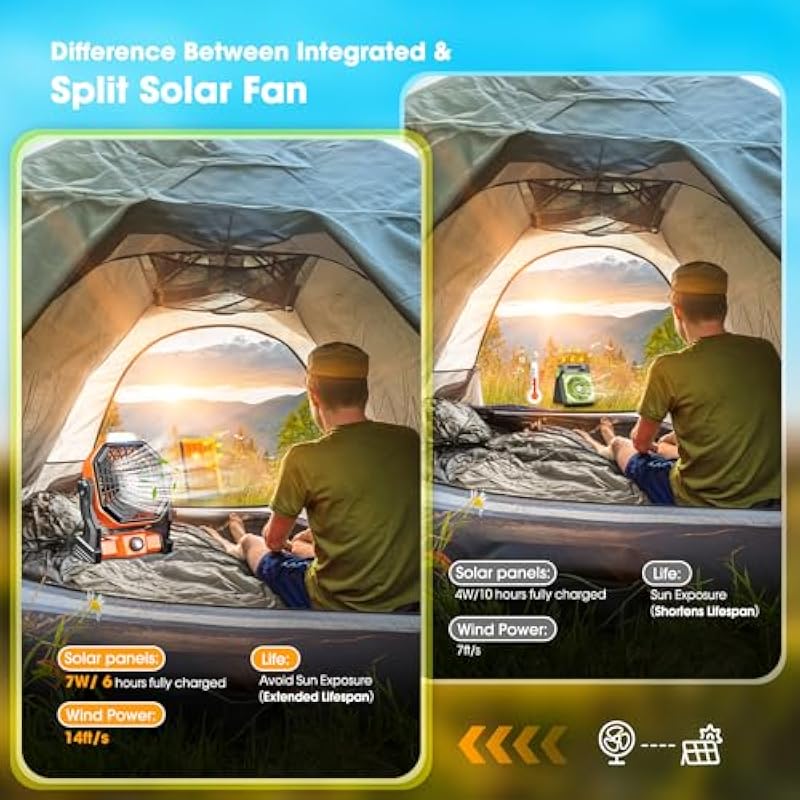 - 🌞【Advantage of Split Fan】- 😊Our split solar fan equipped with 1M connecting cable, the solar panel is placed in the sun to absorb energy, while the fan can be placed in a cool place to avoid exposure to the sun, protecting the battery and ensuring safety. 😥The integrated solar fan can only be placed together with solar panels. It cannot ensure safety if the fan exposed to the sun for a long time, and it cannot be charged in the shade.