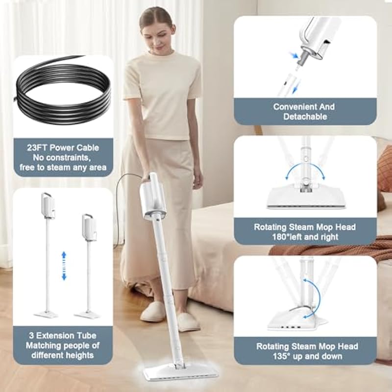 - 【Adjustable and Removable, Convenienct Steam Cleaner】 ✅Equipped with dual cleaning modes, you can choose different mode to fit your needs. The extended 23FT power cord and rotating steam mop cleaner head. With 180-degree horizontal and 135-degree vertical rotation, make cleaning corners and edges a breeze. The three-section detachable pole adjusts to different heights, ensuring a comfortable cleaning experience without any strain.