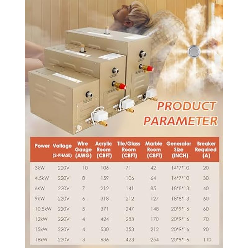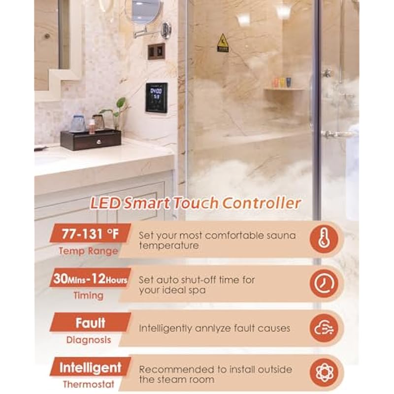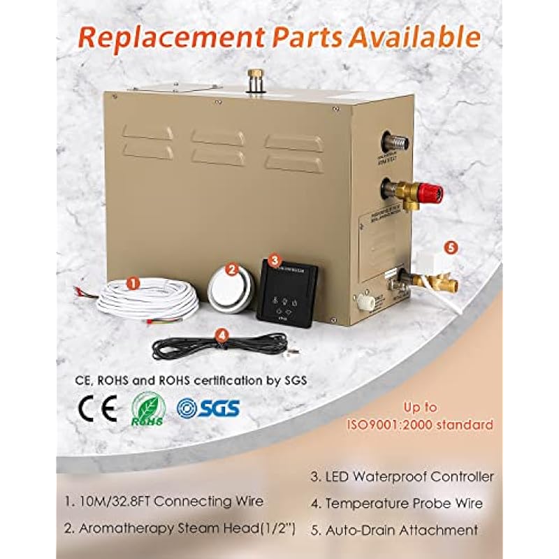 | Included Components | Steam Generator, Aromatherapy Steam Head in 3/4”, LED Waterproof Controller, 32.8Ft Connecting Wire, Temp Probe Wire |