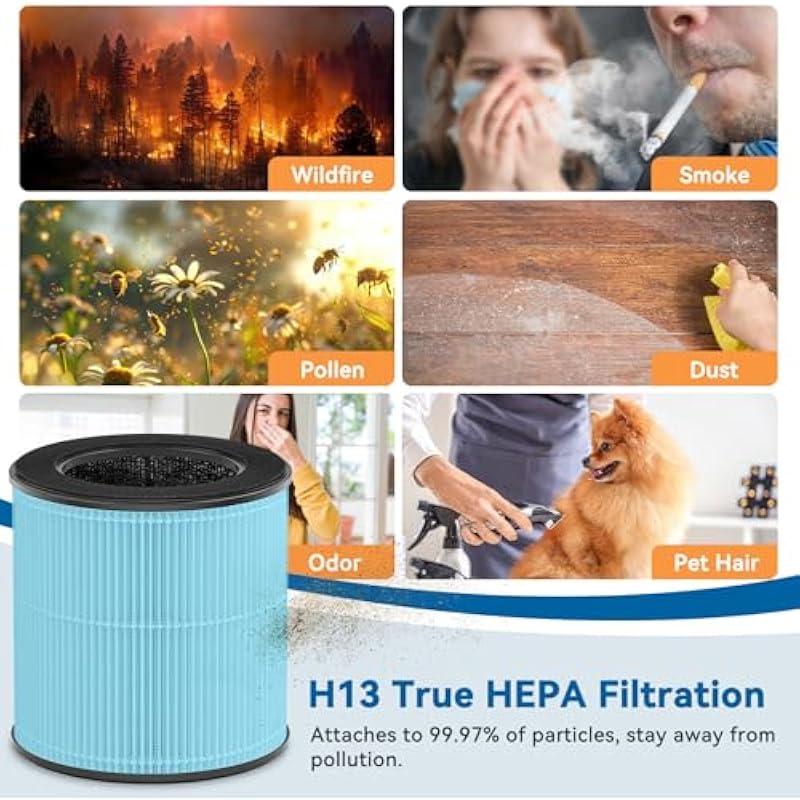 - [Better Air, Better Life] The replacement filter features 3 in 1 filtration System: Pre-filter, H13 true HEPA filter, and Charcoal filtration system work together to purify 99.97% of 0.3-micron particles from dust, pollen, pet dander, smoke, cooking smell, hair and odor. Effectively improve indoor air quality and create a healthy environment.