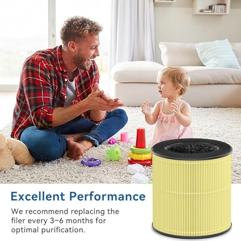 - [Easy to Replace] Simple to replace the filter as the steps below: 1. Flip the air purifier upside down and rotate the bottom cover 2. Remove the cover and the used filter, and replace them with a new filter 3. Place the bottom cover back onto the machine and twist it clockwise until you hear it click in place 4. Press and hold for 3 seconds to reset the filter indicator.