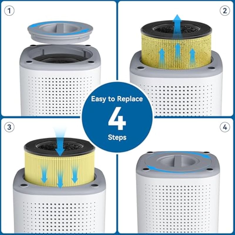 - [Easy to Replace] Simple to replace the filter as the steps below: 1. Flip the air purifier upside down and rotate the bottom cover 2. Remove the cover and the used filter, and replace them with a new filter 3. Place the bottom cover back onto the machine and twist it clockwise until you hear it click in place 4. Press and hold for 3 seconds to reset the filter indicator.