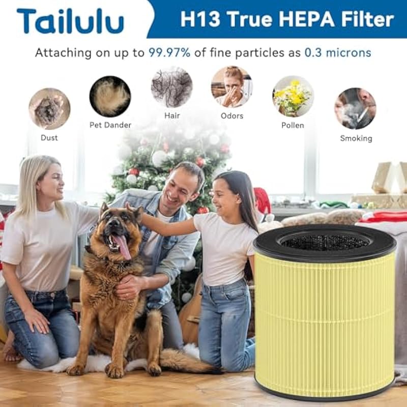 - [Better Air, Better Life] The replacement filter features 3 in 1 filtration System: Pre-filter, H13 true HEPA filter, and Charcoal filtration system work together to purify 99.99% of 0.3-micron particles from dust, pollen, PM 2.5, pet dander, smoke, cooking smell, hair and odor. Effectively improve indoor air quality and create a healthy environment.