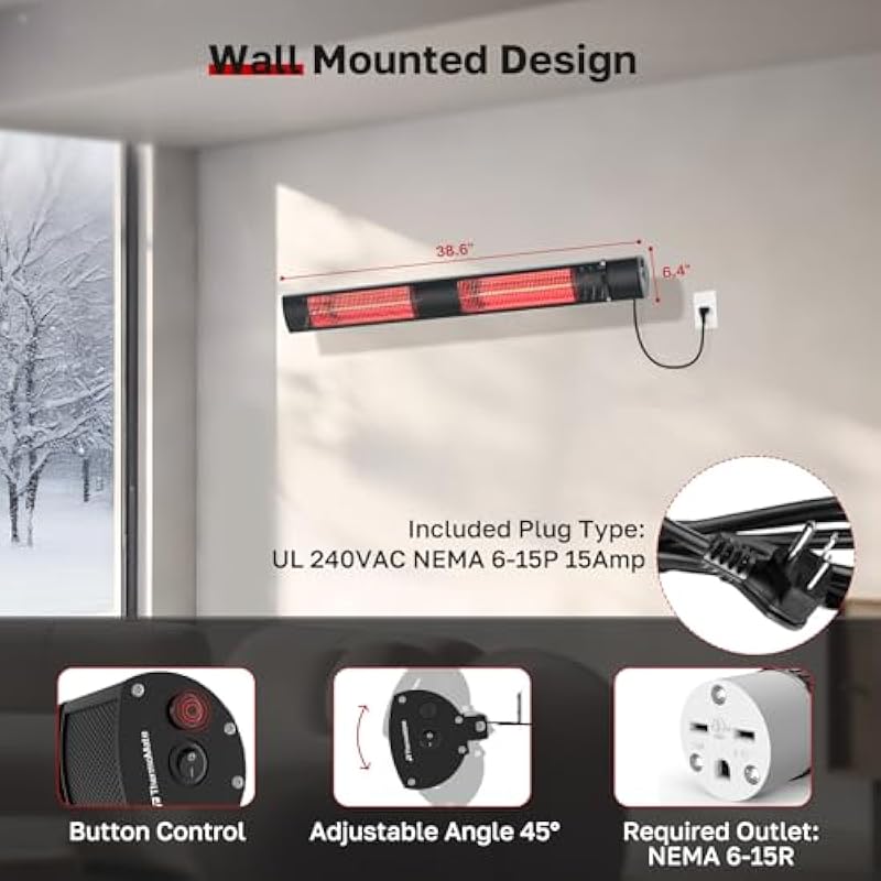 - 120 SQUARE FOOT SPACE – Powerful 240Volt 3000W output, producing heat to cover 100 sq.ft outdoor area or 130 sq.ft enclosed area. Recommended least mounting height 7.88 feet.