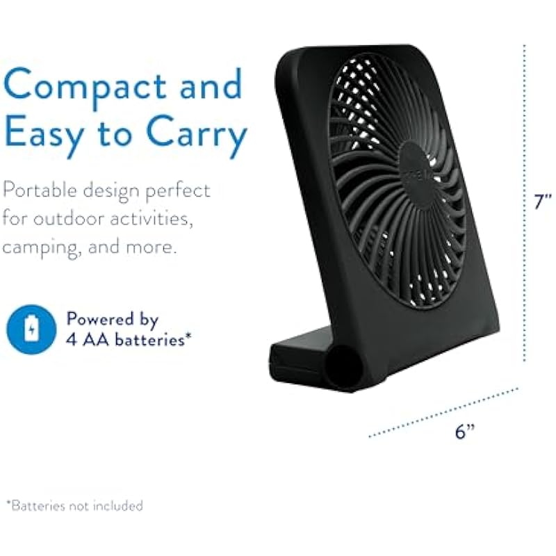 - EASY TO USE: This personal fan runs on four AA batteries (not included). To install, slide out the battery door and insert batteries following (+/-) marks, then replace door.