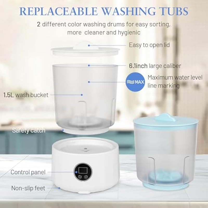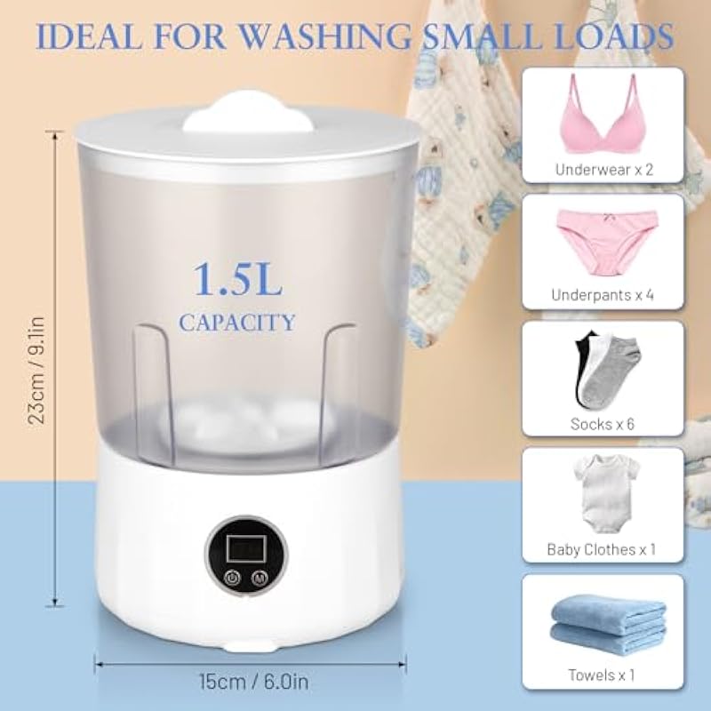 - 【Dual-Bucket Hygiene System & Zero Cross-Contamination】 Revolutionize laundry hygiene with two completely isolated washing cups (1.5L each). Unlike traditional “sequential washing,” our exclusive dual-bucket design ensures 100% separation for underwear, socks, and baby clothes – eliminating germ transfer. Perfect for health-conscious homes!