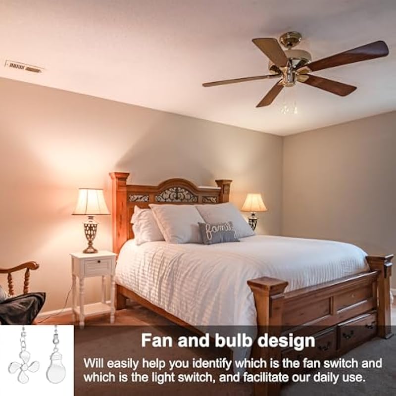 - Advantage: 1. Fan and bulb design, fan pull chain will easily help you identify which is the fan switch and which is the light switch, and facilitate our daily use. 2. The ceiling fan pull chain is made of quality alloy, it is heavy enough and will not sway in the wind, is sturdy and resistant to falling, rust-resistant, not easy to be hurt and fade, and has a long service life. 3. The length is suitable and can be reached by raising your hand, making it easy for you to switch on and off.