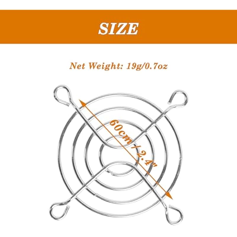 - Lightweight and Compact Size: Small in size, light in weight, easy to install. Net Weight: 0.7oz; Total Size: 58 x 58mm/2.3″ x 2.3″(L*W). Package Content: 2 x Metal Fan Guard.