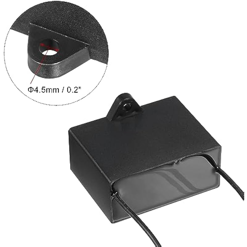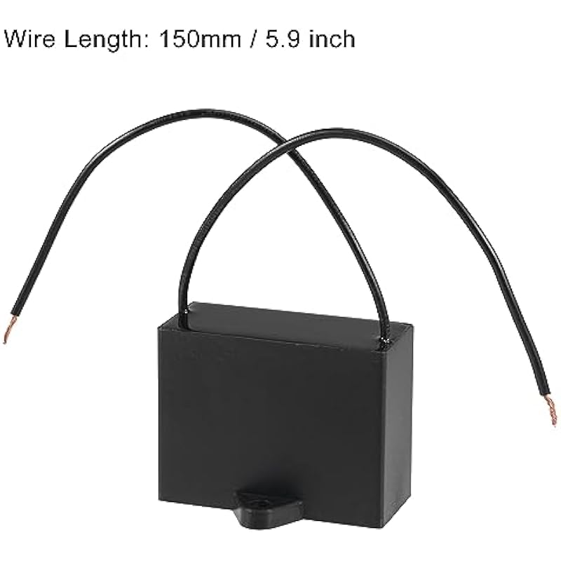 - Model: CBB61; Material: Polypropylene Film Plastic Shell; Terminal: 2 Wires; Tolerance: ±5%; Rated Capacity: 6uF; Climatic Category: 40/70/21; Body Size:48 x 32 x 32mm/1.87 x 1.25 x 1.25 inch(L x W x H); Wire Length:9cm/3.51inch; Shell Color: Black; Rated Voltage: 450V AC; Rated Frequency:50/60Hz; Pack of 5Pcs CBB61 Capacitor