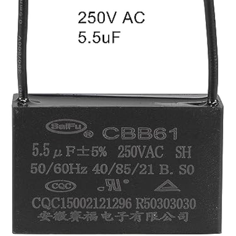 - [Specification] -Rated Capacity: 5.5uF; Tolerance: ±5%; Rated Voltage: 250V AC; Cover Size: 47x29x18mm / 1.9×1.1×0.7inch; Rated Frequency: 50/60Hz; Climatic Category: 40/85/21