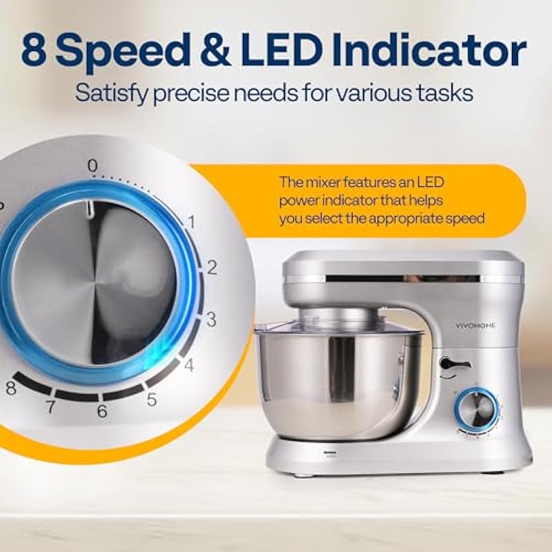 - 8 SPEED SETTINGS & LED INDICATOR: Handy 8-speed control meets the precise needs of various mixing tasks; Whether you’re mixing fine flour, thick dough, or eggs, you’ll find the right speed; The pulse function delivers powerful bursts for better control, ideal for breaking down large chunks and preventing overmixing; The mixer includes an LED power indicator to help you select the correct speed; Suction cups on the base keep the kitchen mixer securely in place