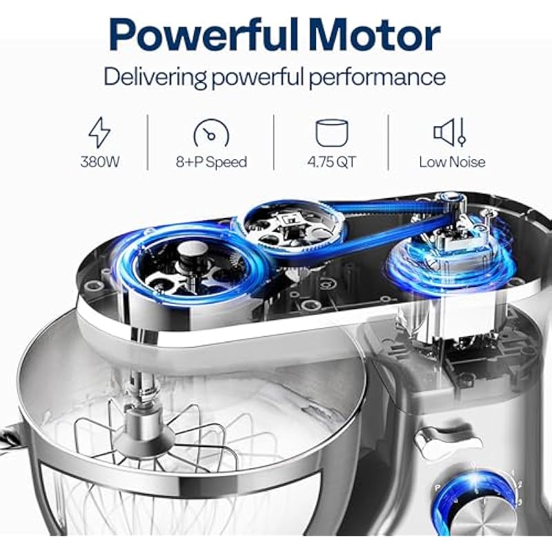 - POWERFUL MOTOR: Equipped with a high-performance 380-watt motor, this stand mixer ensures effortless and consistent whipping, beating, kneading, and thorough mixing; The all-metal gears provide stability and quiet operation (noise level ≤ 76dB); The planetary mixing design moves the beaters around the bowl for even and thorough mixing