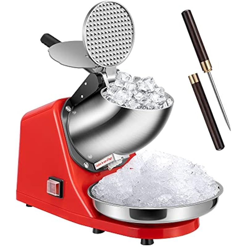 - HIGH EFFICIENCY – Electric (plug-in) power does the work for you; Rapidly shaved ice (143 lbs. of ice per hour) to meet large demands easily; The powerful motor and sharp blade produce soft, fluffy, and powdery snow ice; You can also adjust the thickness of the shaved ice by adjusting the blade; Higher crusher body and elbow make the machine more good-looking while leaving more space for containers like goblets, cups, bowls, and so on