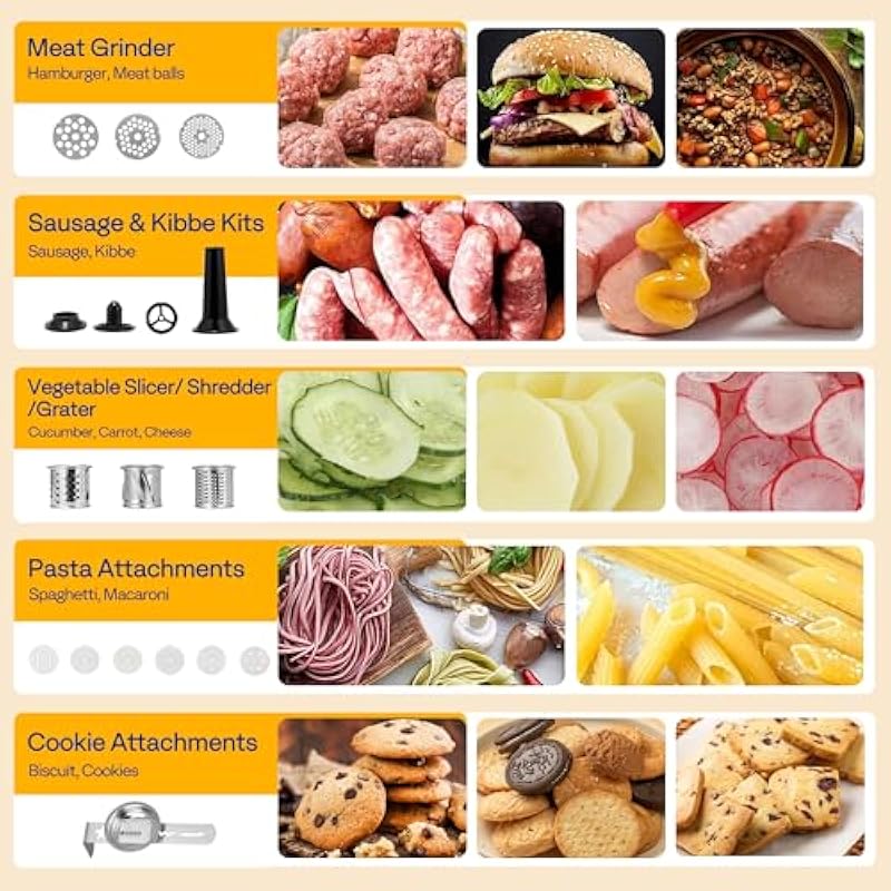 - ALL-IN-ONE 9-IN-1 STAND MIXER: This multifunctional mixer with a 660 W motor offers nine functions including mixing, kneading, grinding, juicing, and more; It also includes a wide range of accessories such as a dough hook for kneading flour, a beater for mixing butter, and a whisk for whipping cream; Additionally, a blender for drinks, a meat grinder for fresh ground meat, noodle and cookie attachments, and vegetable slicer accessories offer even more versatility; Perfect for holiday meals, family gatherings, and picnics