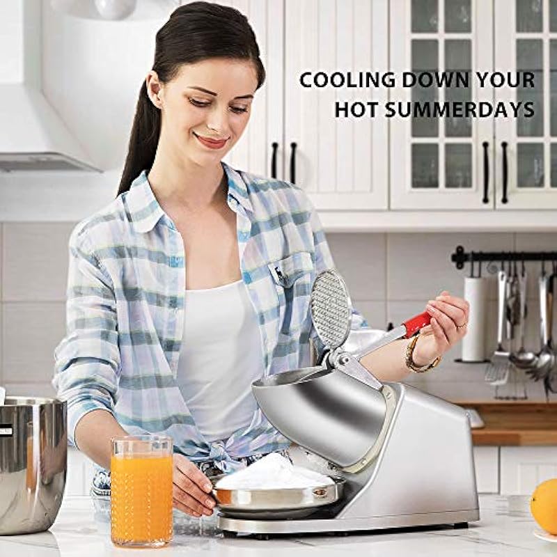 - HIGH-QUALITY MATERIALS – Built with food-grade corrosion-free stainless steel hopper and blade; Rust-proof and hygienic conditions guarantee food safety; Easy-clean mechanics design makes your life easier, saving you energy and time; The food-grade stainless-steel bowl is included for catching shaved ice; Note: please rotate the ice bowl during use