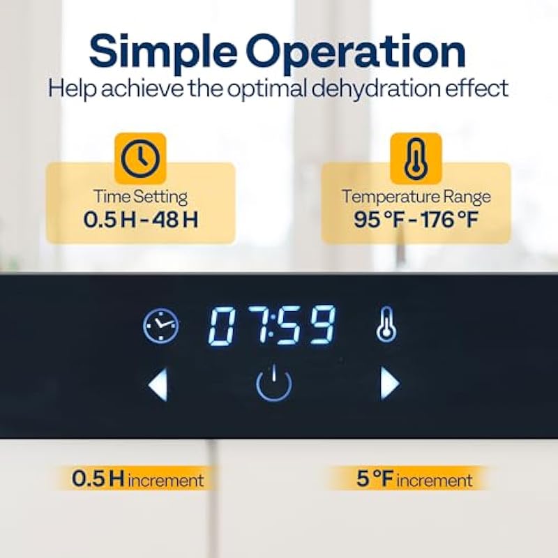 - SIMPLE OPERATION: This electric food dehydrator features a digital touch control panel that allows you to set the time and temperature for perfect dehydration conditions easily; The time increment is 30 minutes, with a maximum setting of 48 hours, while the temperature can be adjusted in 5°F increments within a range of 95°F to 176°F; The timer function enables worry-free operation, while the quiet operation of 48 dB makes it suitable for use even at night