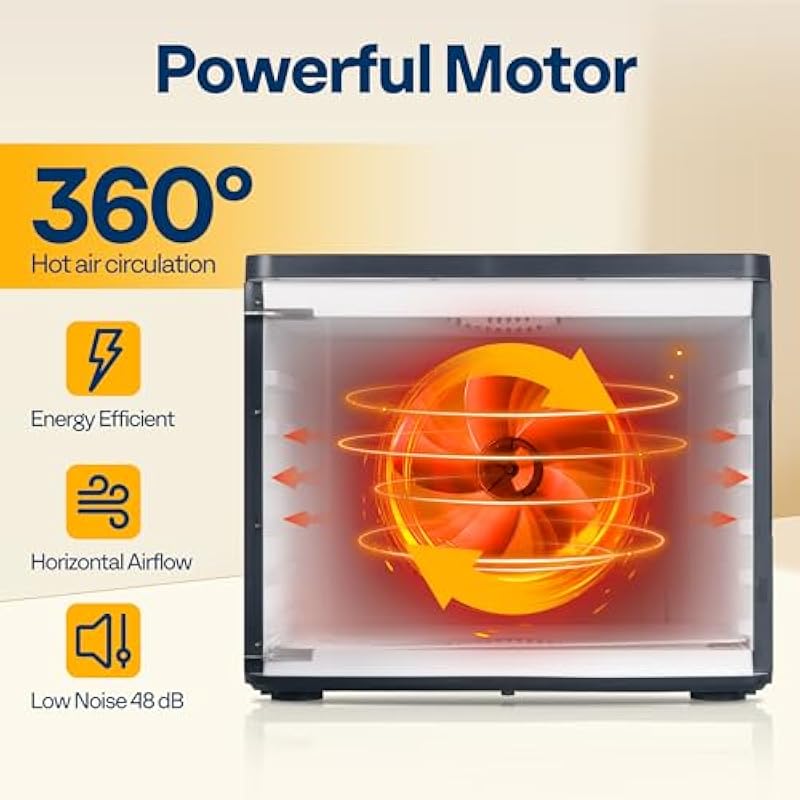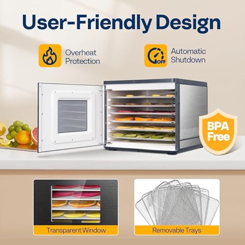 - USER-FRIENDLY DESIGN: The transparent window allows you to effortlessly monitor the progress of dehydration, ensuring the optimal flavors are perfectly preserved; The easily removable trays offer ample space for different slice sizes, making it versatile and convenient to use; For added safety, it features automatic shut-off at the timer’s end and intelligent overheat protection that cuts power if the temperature is too high